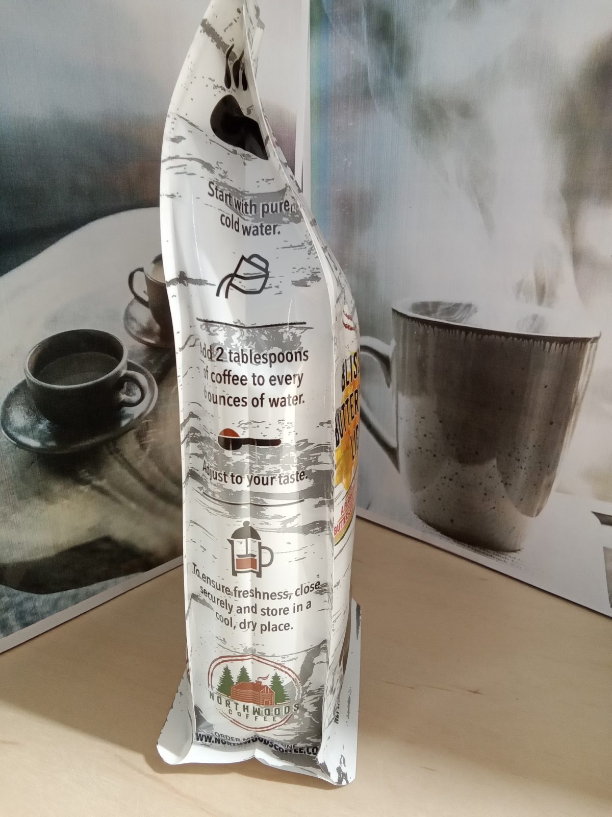 This product is Northwoods Coffee Blissful Butterscotch Lights 12oz Ground Coffee. It is a medium roast ground coffee with a flavor profile of a perfect blend of butterscotch and toffee. This coffee is made in the United States and is part of the Pantry aisle. Enjoy the delightful taste of butterscotch and toffee in every sip of this Northwoods Coffee blend.